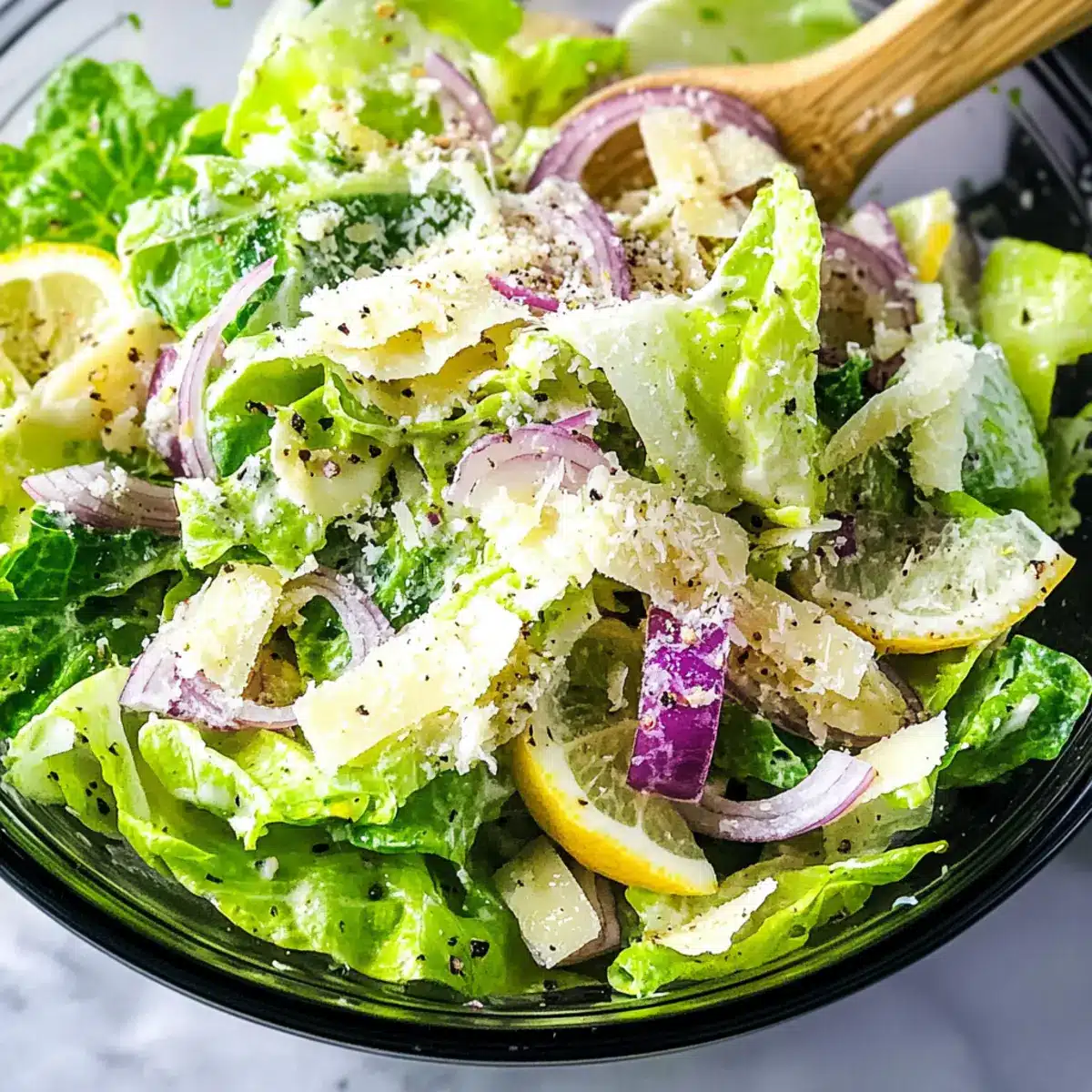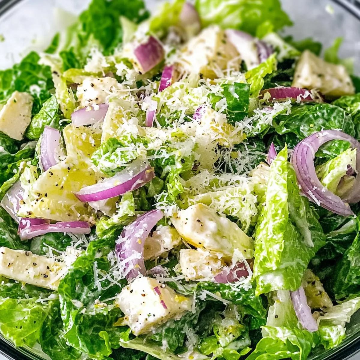 - Zutaten kombinieren: In einer großen Salatschüssel den gehackten Romaine-Salat, rote Zwiebel, Parmesanstückchen und Crushed Red Pepper Flakes hinzufügen.