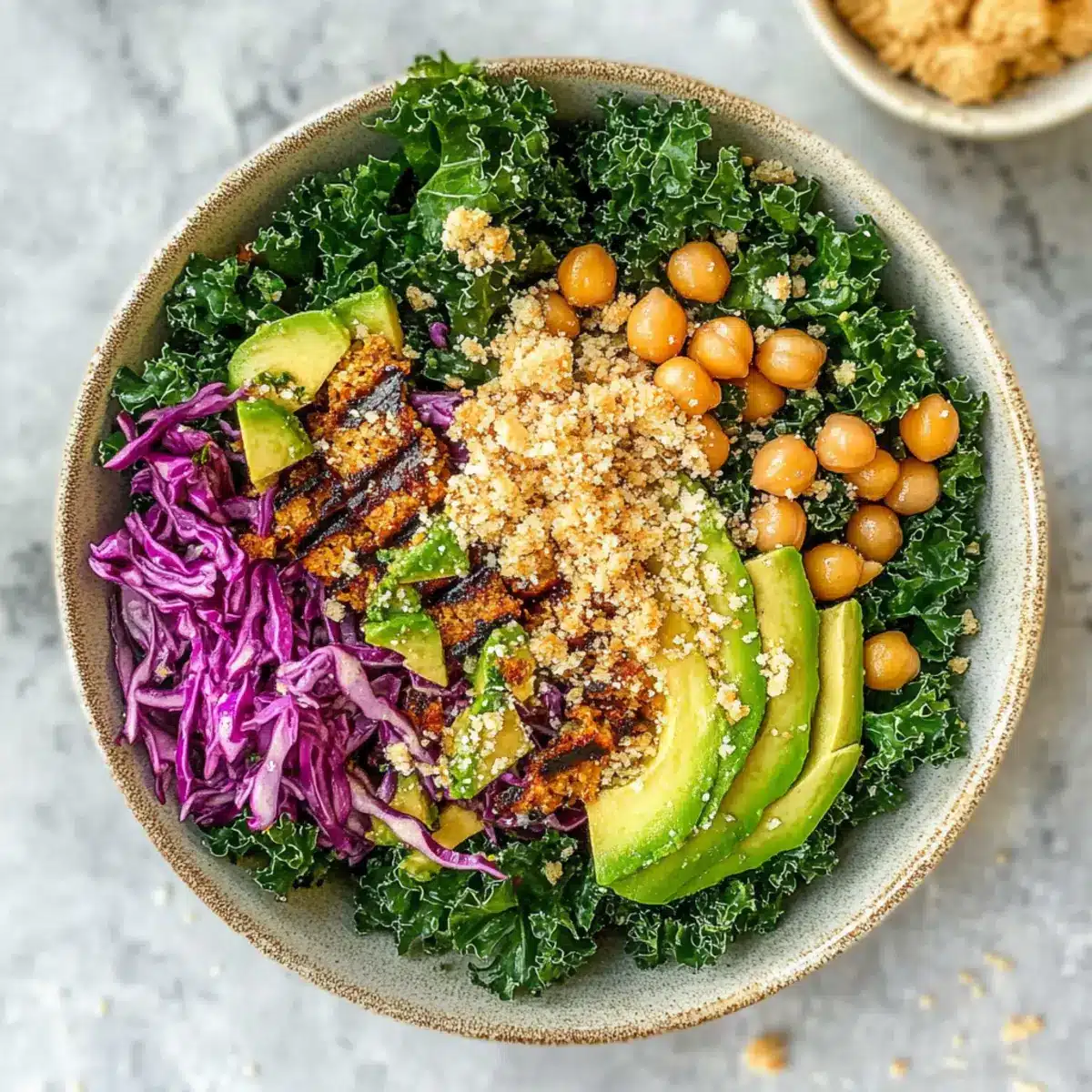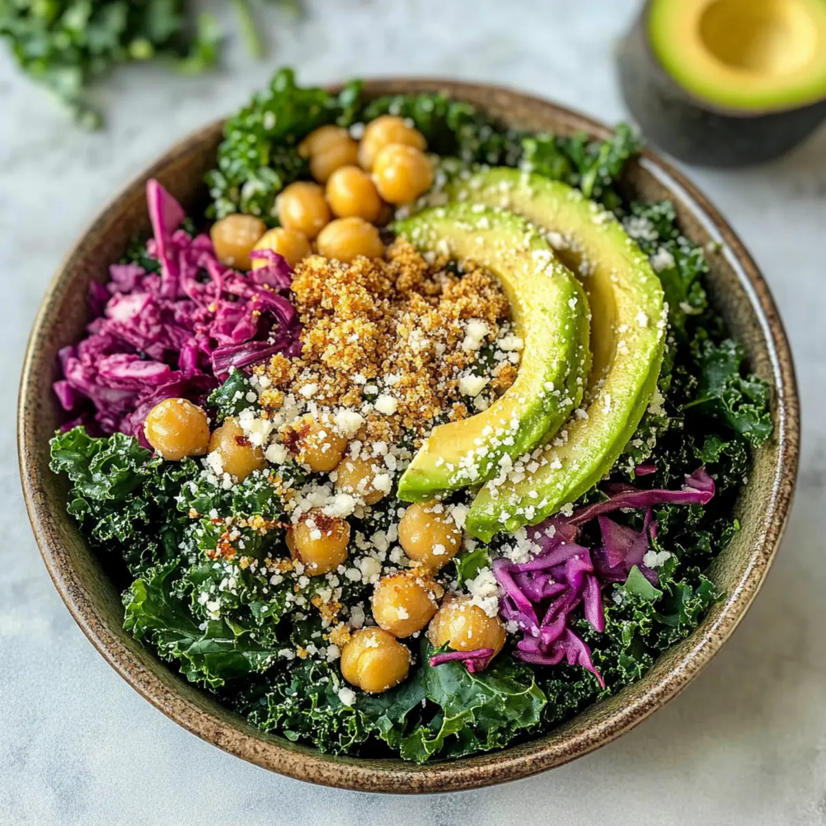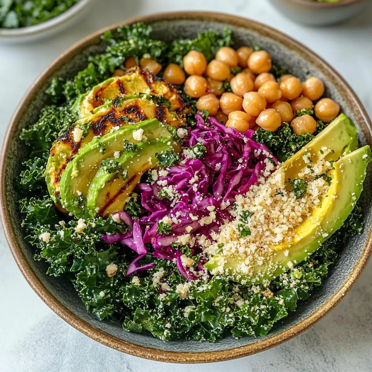 Massiere 250 g frisch gewaschenen und grob gehackten Curly Kale mit einem Viertel des Dressings, bis die Blätter weich sind und glänzen. Füge dann eine Schicht des eingelegten Rotkohls, die knusprigen Kichererbsen, das geröstete Panko und die gegrillten Avocadohälften hinzu ohne die Avocado zu zerdrücken. Beträufle den Salat nach Belieben mit dem restlichen Dressing und serviere ihn sofort, um die frischen Aromen zu genießen.