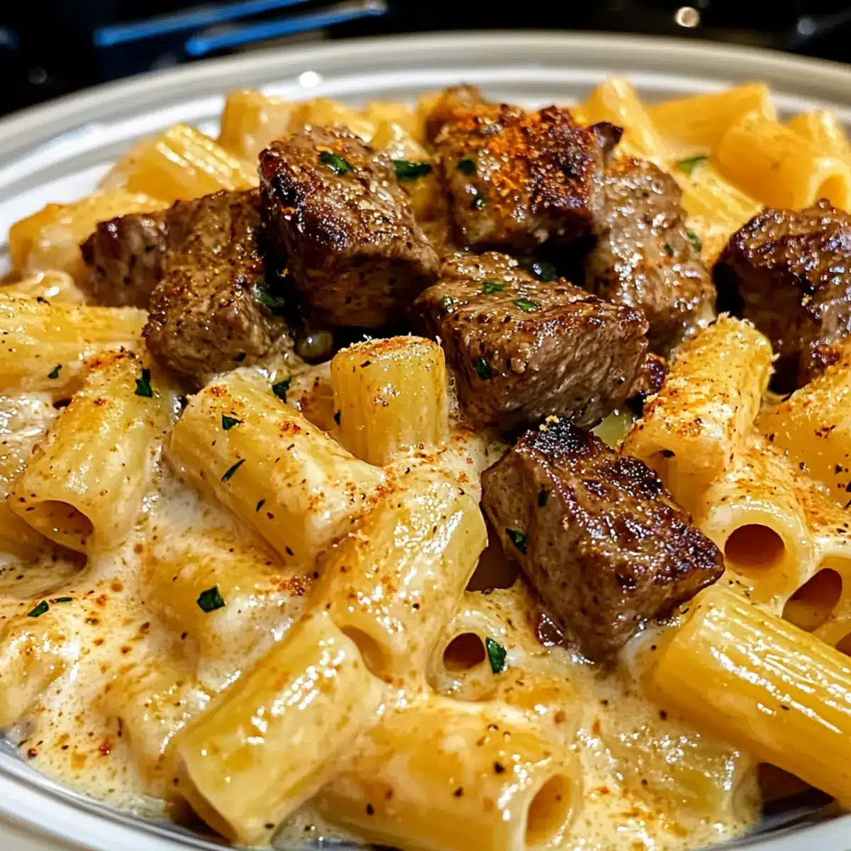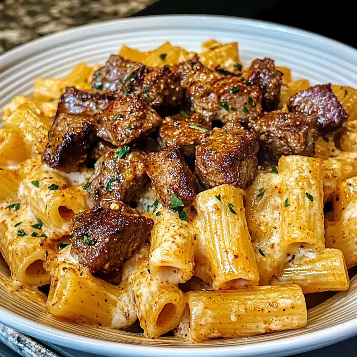Cajun Steakstücke in käsiger Rigatoni-Parmesansauce