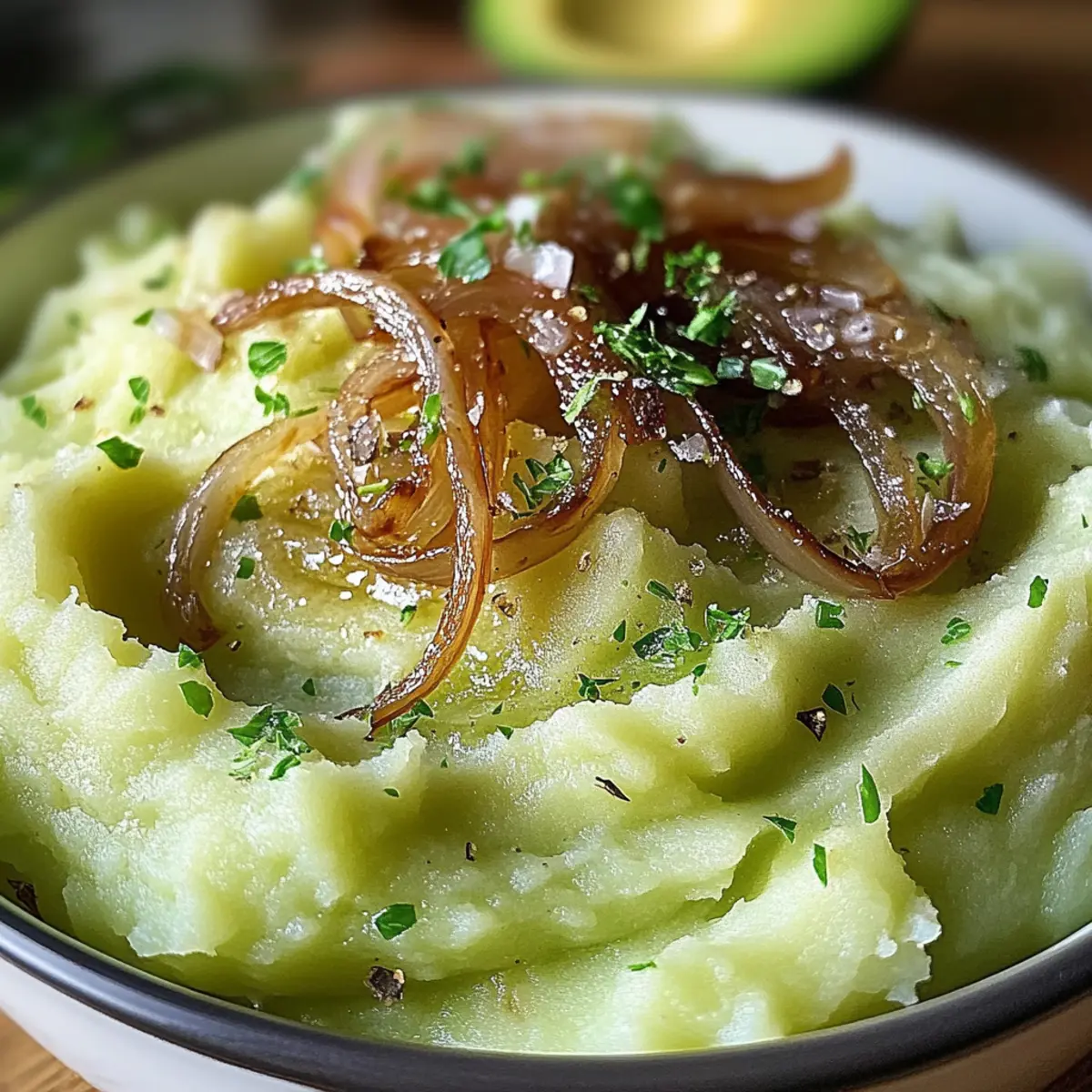 Cremige Avocado-Kartoffelbrei mit karamellisierten Schalotten