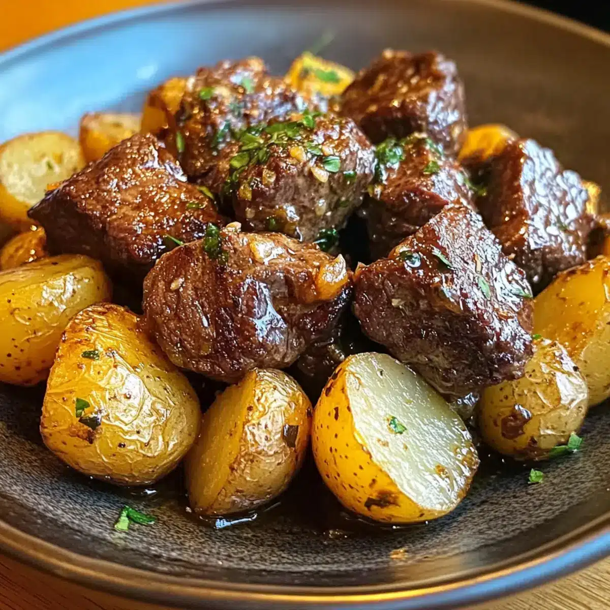 Knoblauchbutter-Rindfleischbissen und Kartoffeln einfach genießen