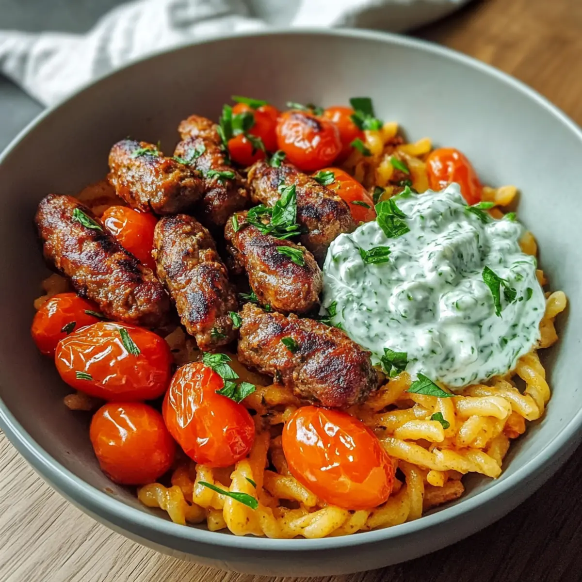 Tomaten Kritharaki mit veganen Cevapcici und Tzatziki