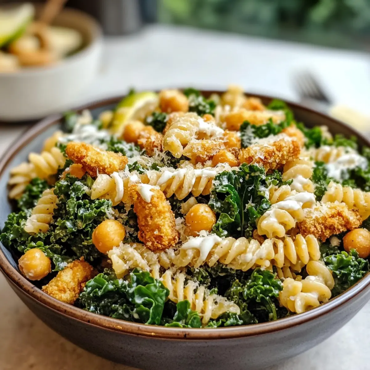 Kale Caesar Nudelsalat mit knusprigen Kichererbsen