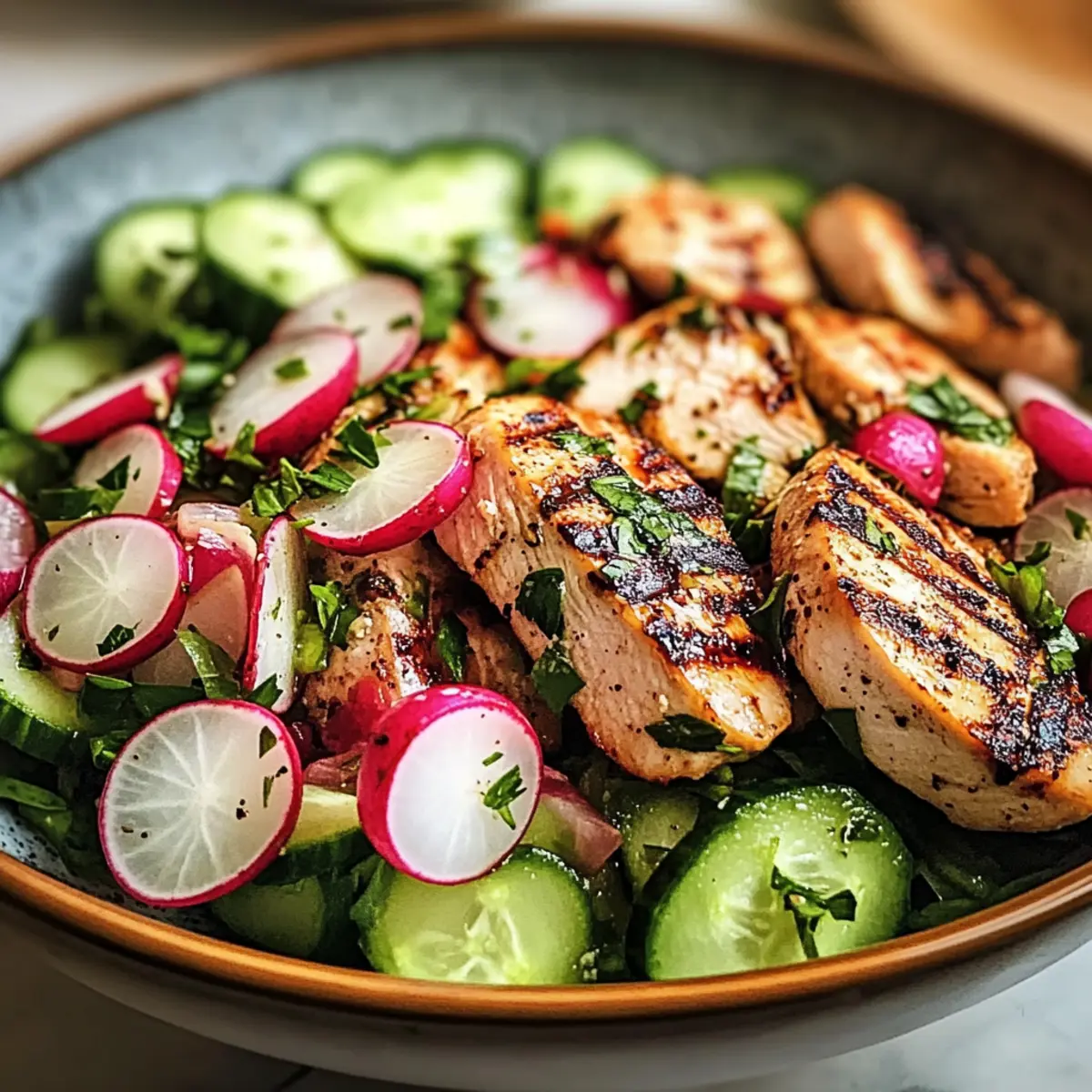 Zesty Radieschen Gurkensalat mit Gegrilltem Hähnchen