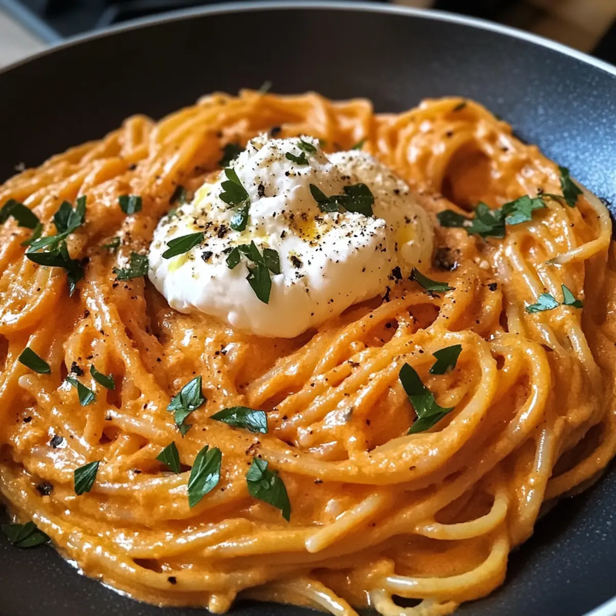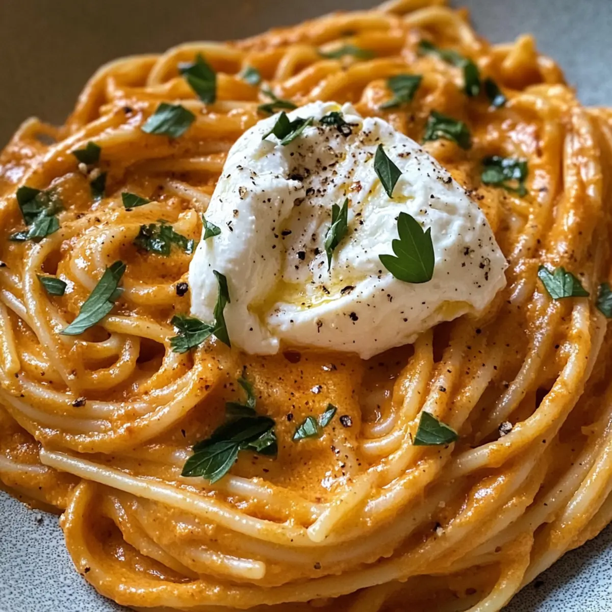 Cremige rote Paprika-Pasta mit Burrata genießen