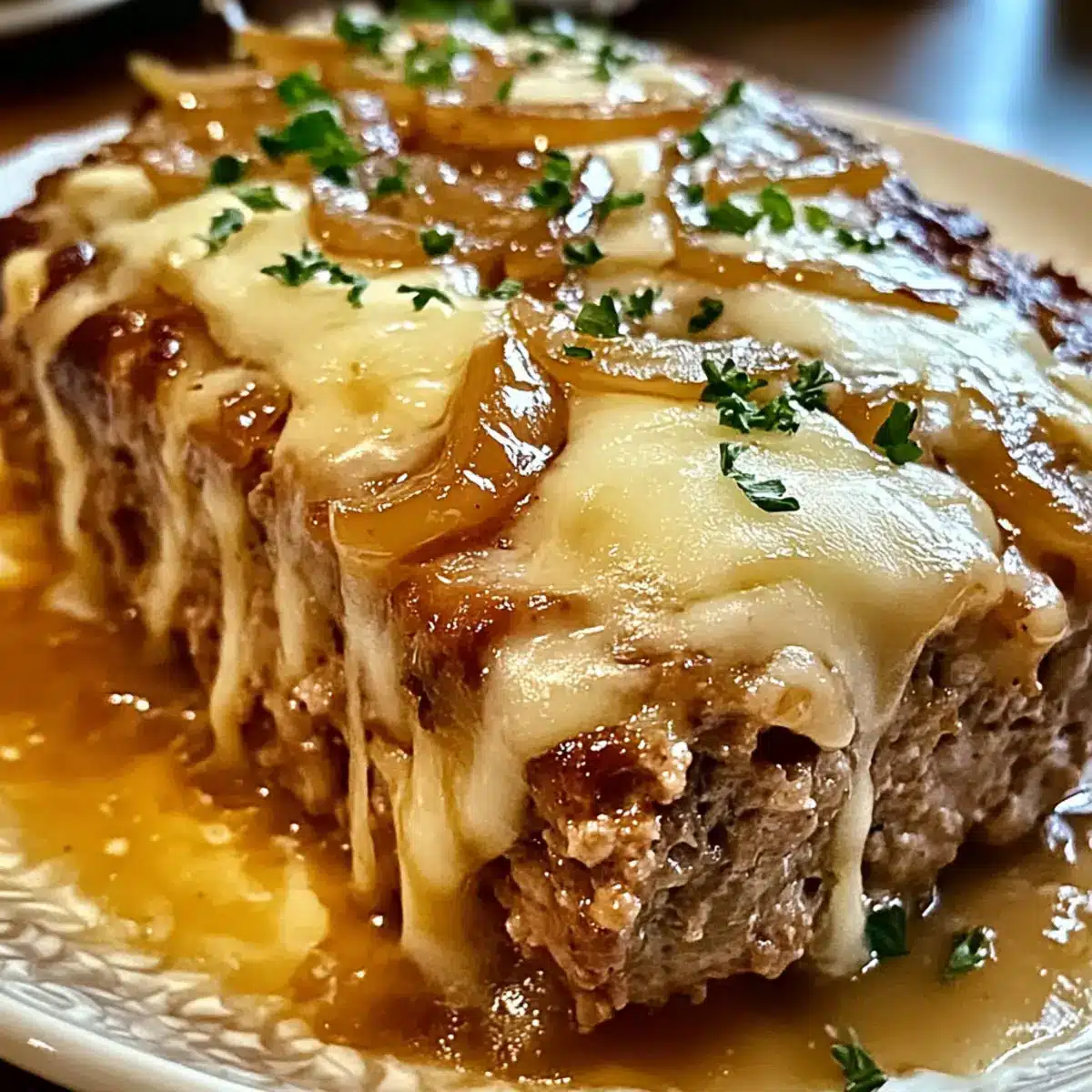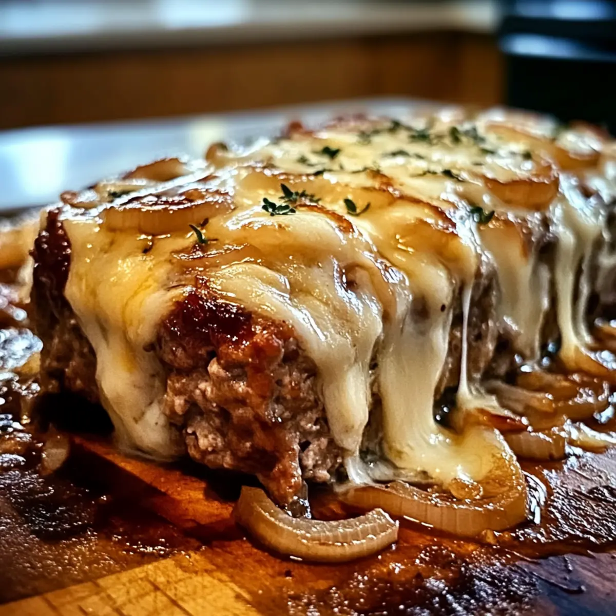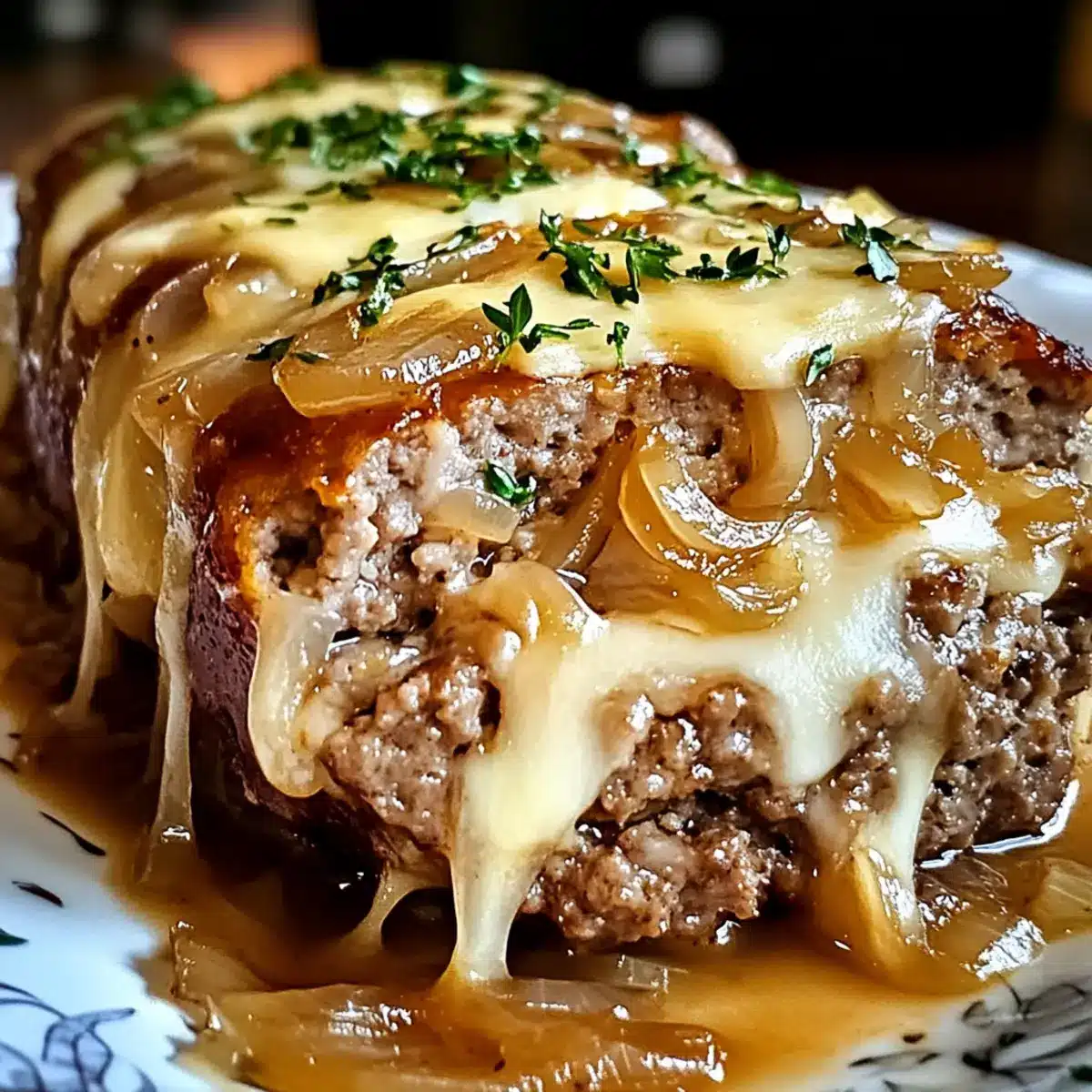 Savory Aromen: Der Französische Zwiebel-Fleischlaib kombiniert die klassischen, herzhaften Geschmäcker von Fleischlaib und französischer Zwiebelsuppe in perfekter Harmonie. Einfachheit: Die Zubereitung ist unkompliziert und erfordert keine speziellen Kochkünste, ideal für schnelle Abendessen unter der Woche. Vielseitig: Mit einfachen Variationen, wie dem Austausch von Kräutern oder Käse, kannst du das Rezept an deinen Geschmack anpassen. Familiengerecht: Dieses Gericht ist ein Hit bei Groß und Klein und bringt alle zusammen. Herzhafter Genuss: Die süßen, karamellisierten Zwiebeln in Kombination mit dem gesunden Protein aus dem Fleisch sorgen für eine sättigende Mahlzeit. Probiere dazu einen frischen grünen Salat oder cremige Kartoffelpüree aus Creamy Mashed Potatoes.