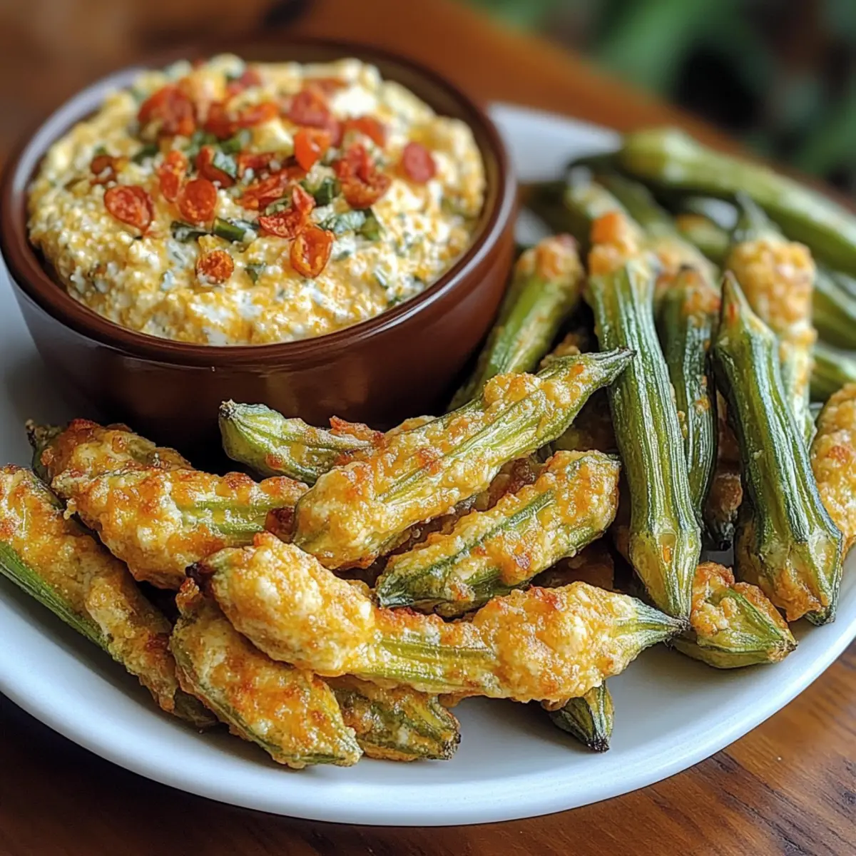 - Die frittierte Okra auf einem Teller anrichten und den Pimento Käse Dip in der Mitte platzieren.
