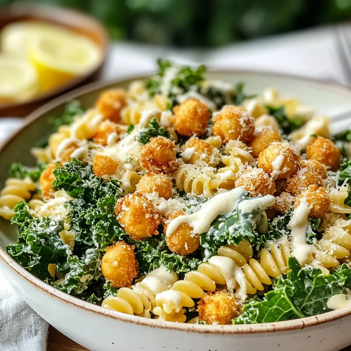Kale Caesar Nudelsalat mit knusprigen Kichererbsen