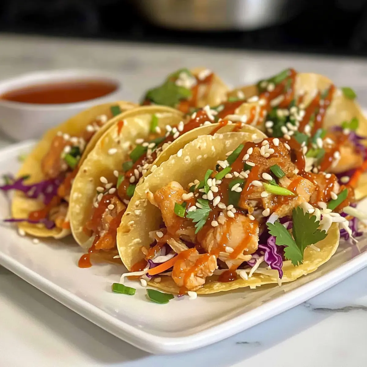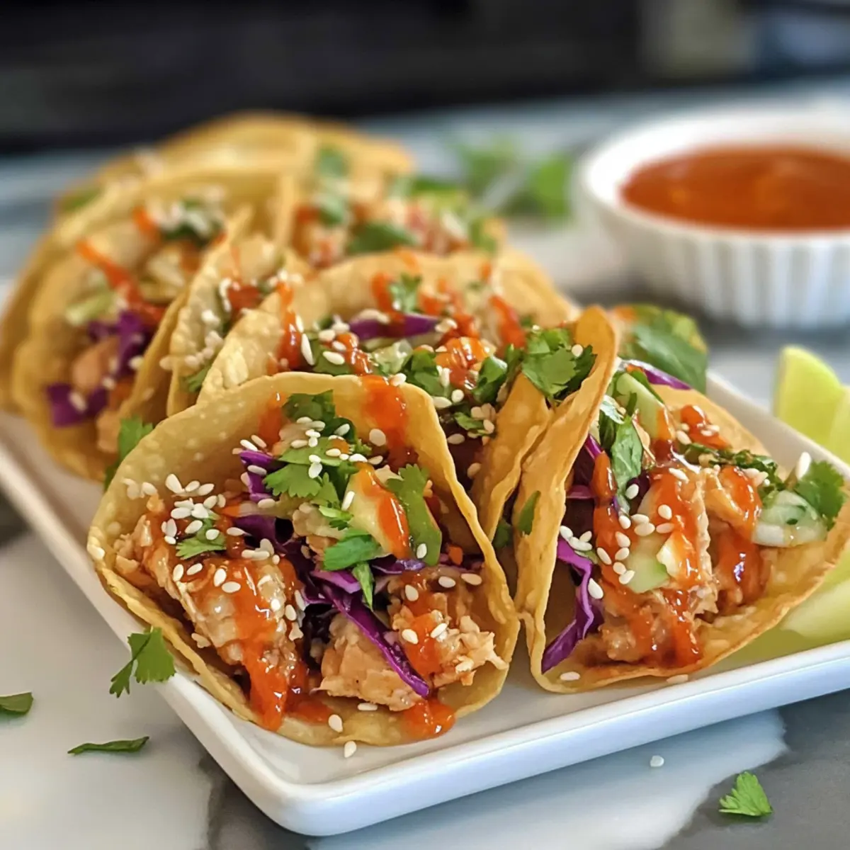 - Tacos zusammenstellen: Wonton-Schalen mit gebratenem Hühnchen füllen, mit Slaw-Mischung toppen und mit süßer Chilisauce sowie Garnitur versehen.