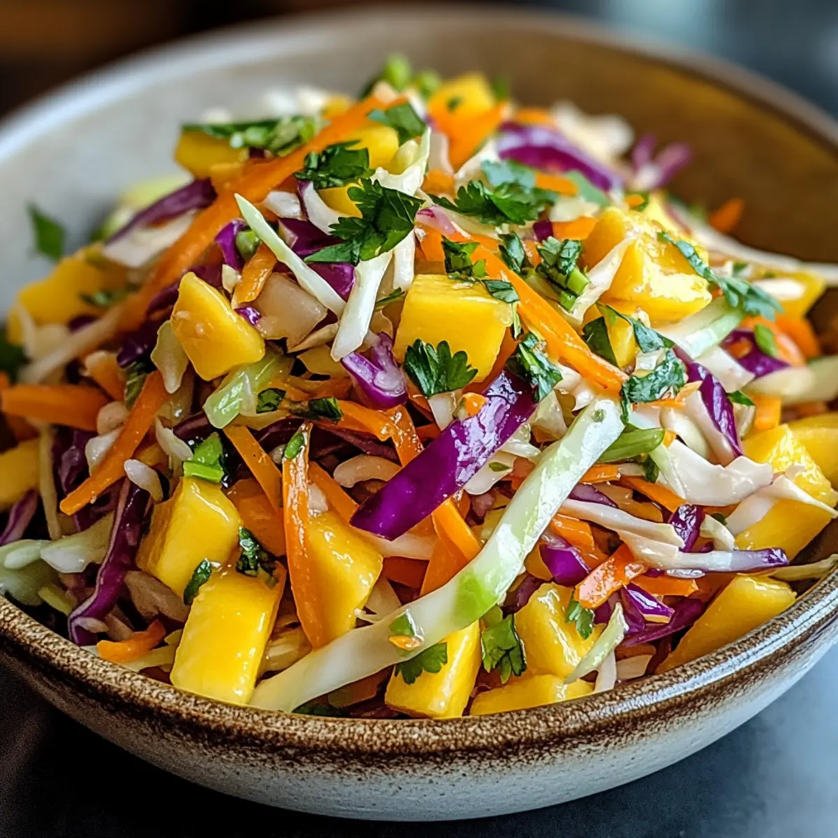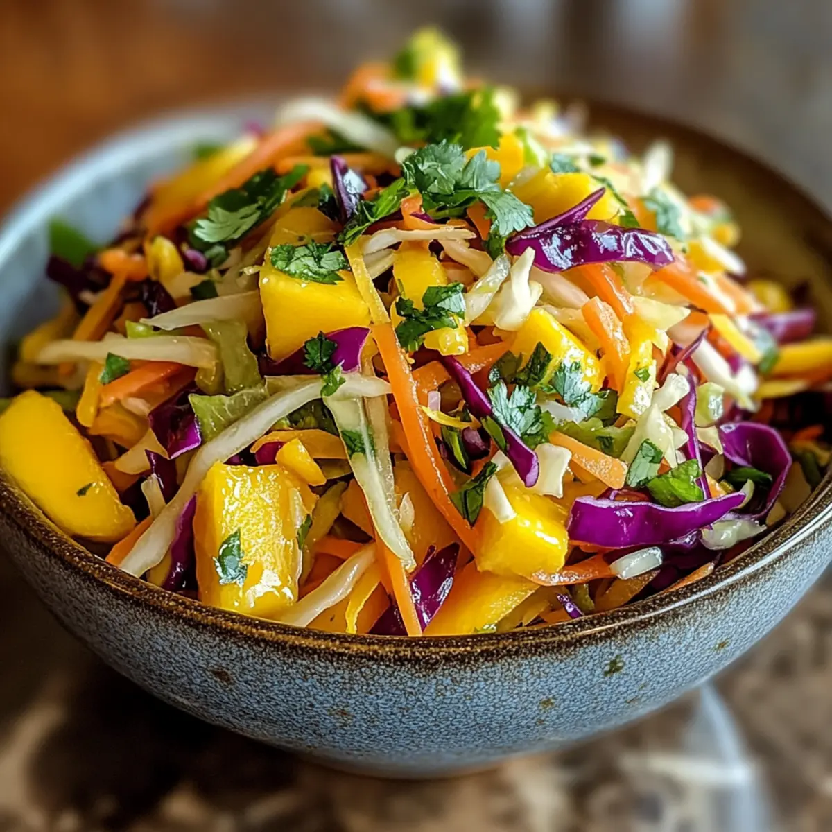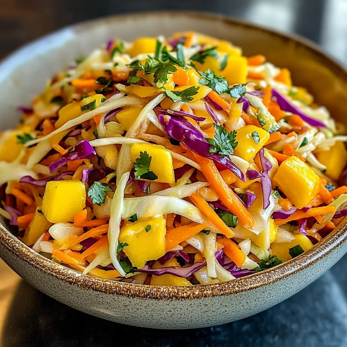 Beginne mit der Vorbereitungen: Schneide die reifen Mangos in kleine Würfel, den Weißkohl in feine Streifen, die Karotte grob und die rote Paprika in dünne Scheiben. Die rote Zwiebel kannst du in feine Ringe schneiden; falls gewünscht, weiche sie kurz in Wasser ein, um den Geschmack zu mildern. Hacke den frischen Koriander grob. Alle Zutaten in eine große Rührschüssel geben.