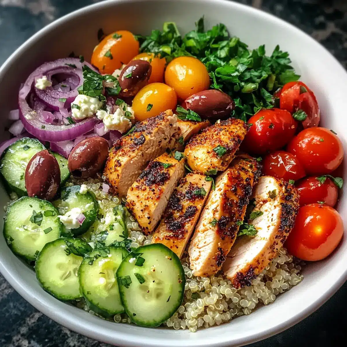 Füllt eine Schüssel zuerst mit der fluffigen Quinoa als Basis. Belegt die Quinoa mit den geschnittenen Hühnchenstücken, Cherrytomaten, Gurke, roten Zwiebeln, Kalamata-Oliven und zerkrümeltem Feta. Diese bunten Komponenten machen euren Mediterranen Hühnerteller nicht nur schmackhaft, sondern auch optisch ansprechend.