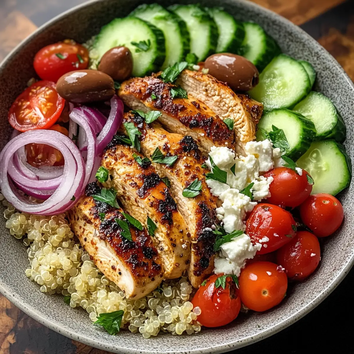 Die Vorbereitung für euren Mediterranen Hühnerteller ist ein echter Zeitgewinn für geschäftige Wochentage! Ihr könnt das Hühnchen bis 24 Stunden im Voraus marinieren, um die Aromen intensivieren — einfach in der Marinade im Kühlschrank lagern. Die Quinoa lässt sich ebenfalls am Vortag kochen und in einem luftdichten Behälter bis zu 3 Tage aufbewahren. Um die Qualität zu erhalten, lagert das Gemüse separat und schneidet es erst kurz vor dem Servieren, was das Verwelken verhindert. Wenn es Zeit zum servieren ist, erhitzt ihr das Hühnchen kurz in der Pfanne oder im Ofen, bevor ihr alles in einer Schüssel anrichtet — so bleibt es frisch und köstlich. Damit zaubert ihr mit minimalem Aufwand ein gesundes, leckeres Gericht!