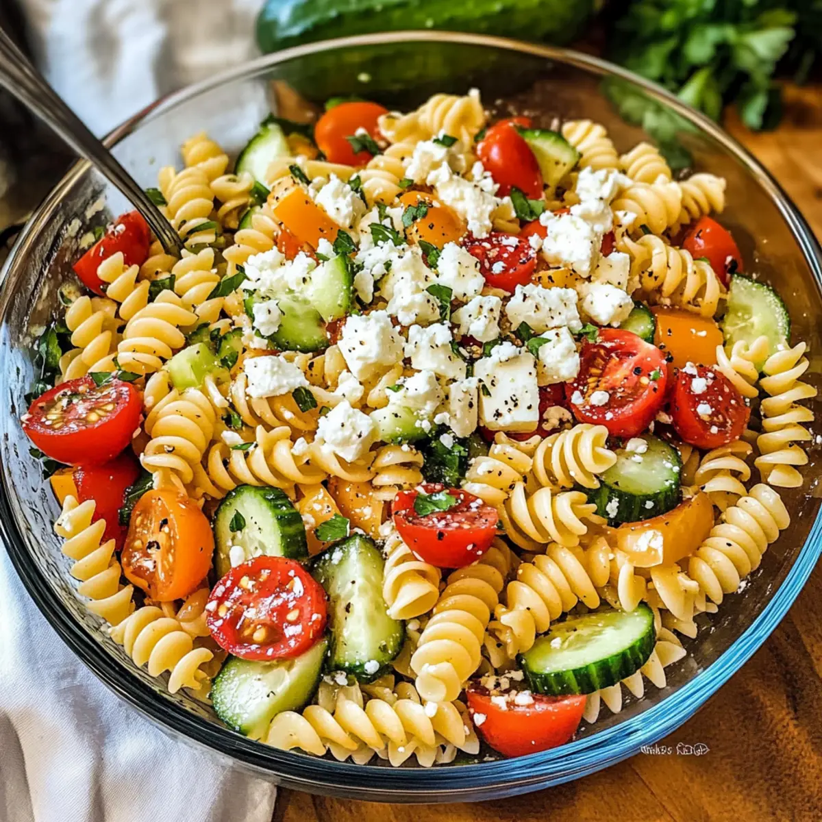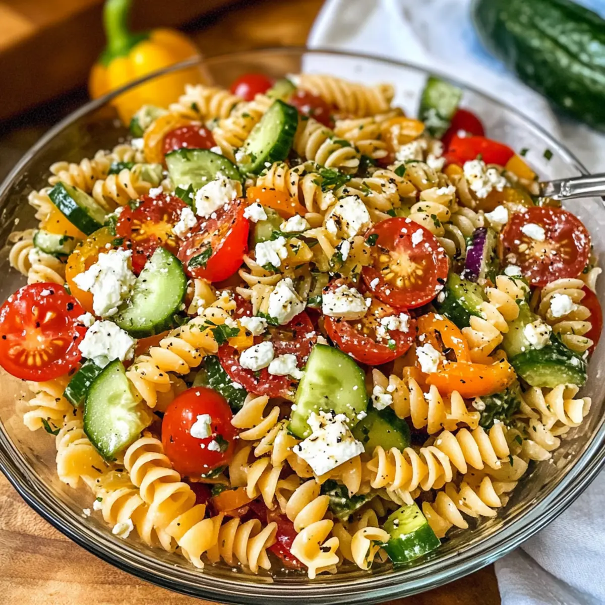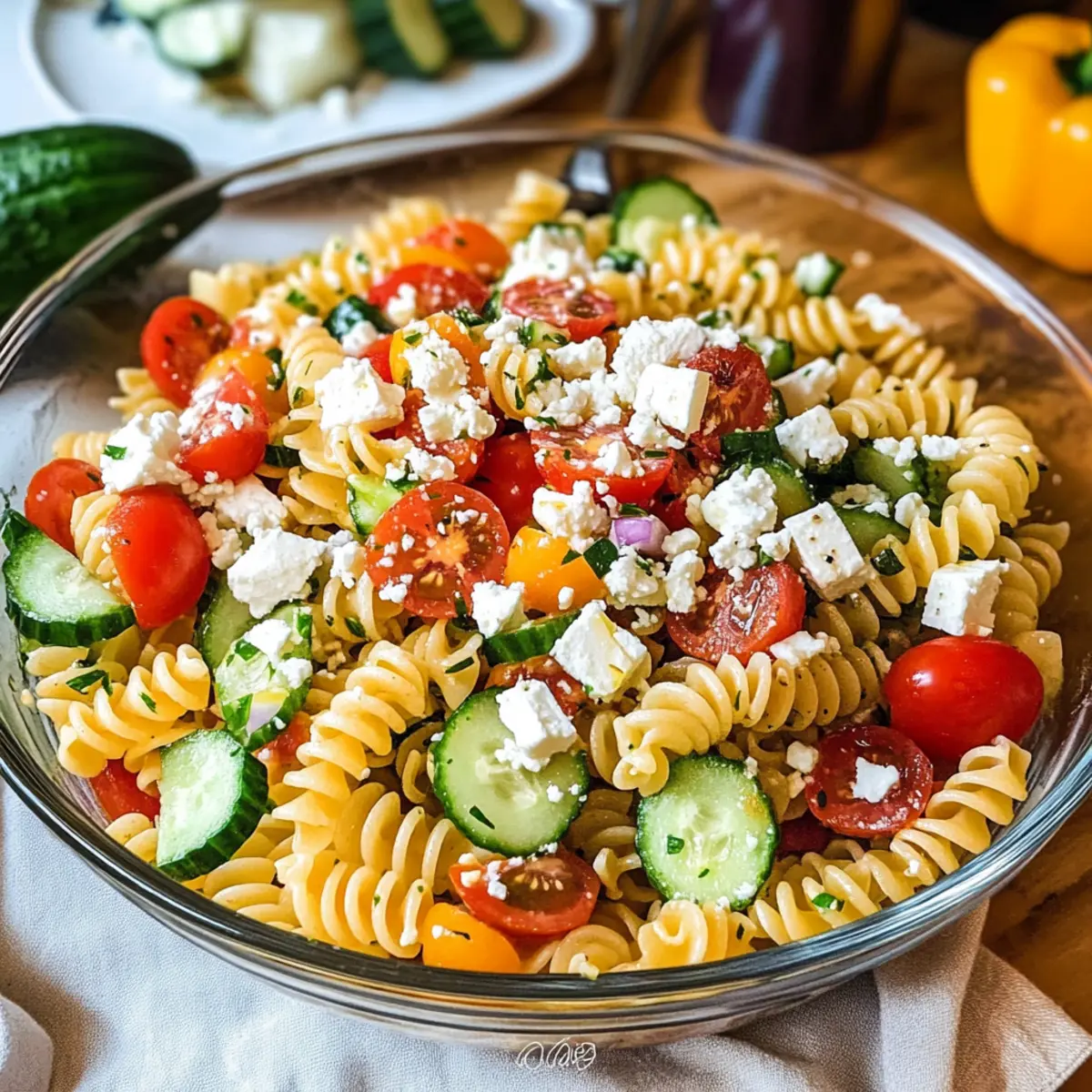 Achte darauf, frisches und knackiges Gemüse zu verwenden, wie Paprika und Gurken. Sie sollten leuchtende Farben und keine dunklen Flecken aufweisen. Für die Tomaten wähle kleine, pralle Kirschtomaten, die für Süße sorgen. Feta-Käse sollte frisch und bröckelig sein, während die Pasta al dente gekocht werden sollte, um die beste Konsistenz zu erzielen.