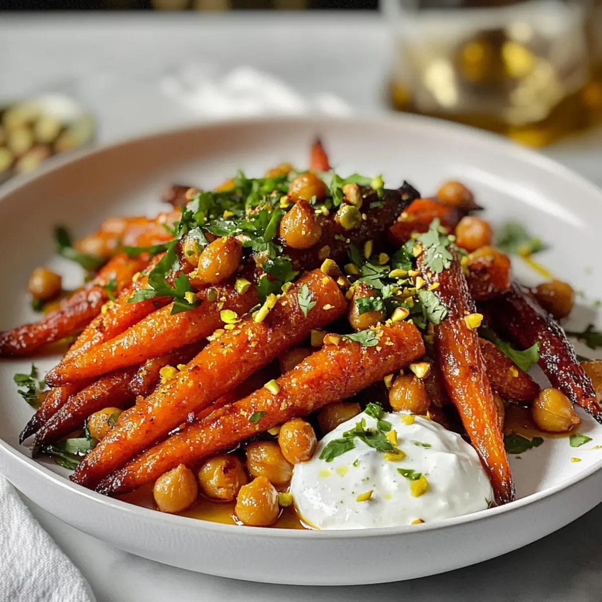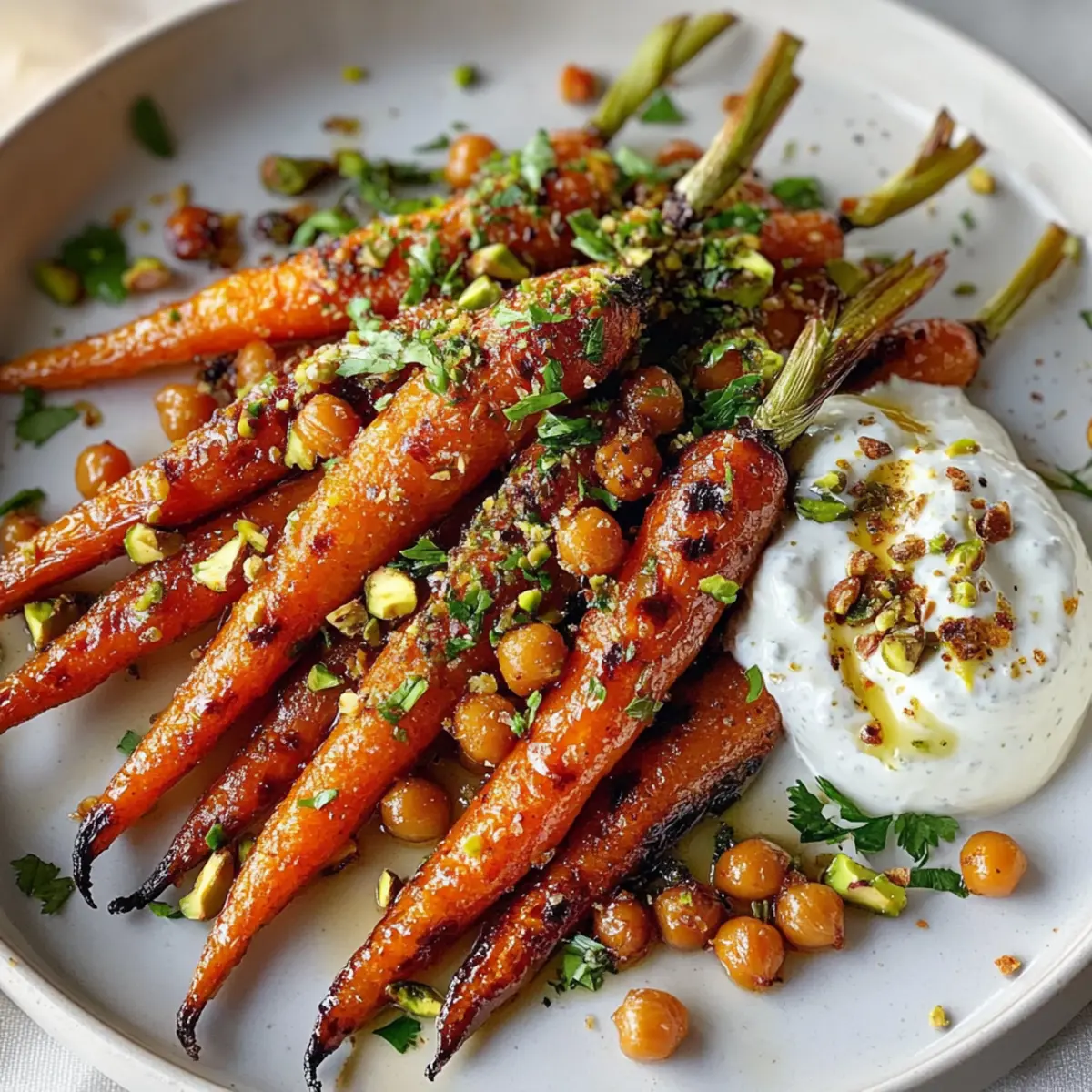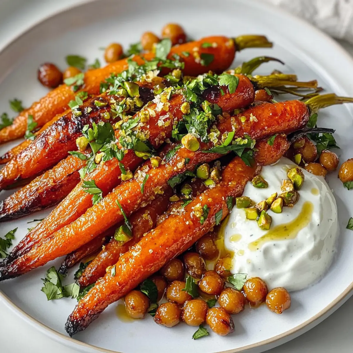 Um das Gericht zu servieren, verteile die Joghurtsoße gleichmäßig auf einem Servierteller. Platziere die warmen Röstkarotten darauf, träufle nach Belieben eine Mischung aus Ahornsirup und Sriracha darüber und streue die knusprigen Kichererbsen darüber. Garniere das Ganze mit frisch gehacktem Koriander und gerösteten Pistazien für das perfekte Finish.
