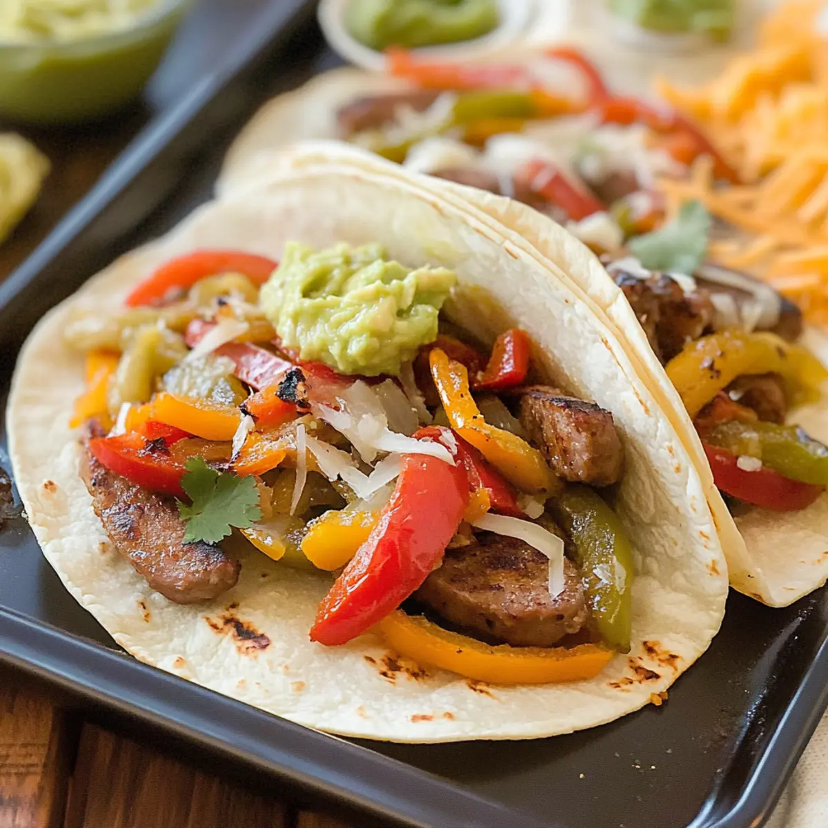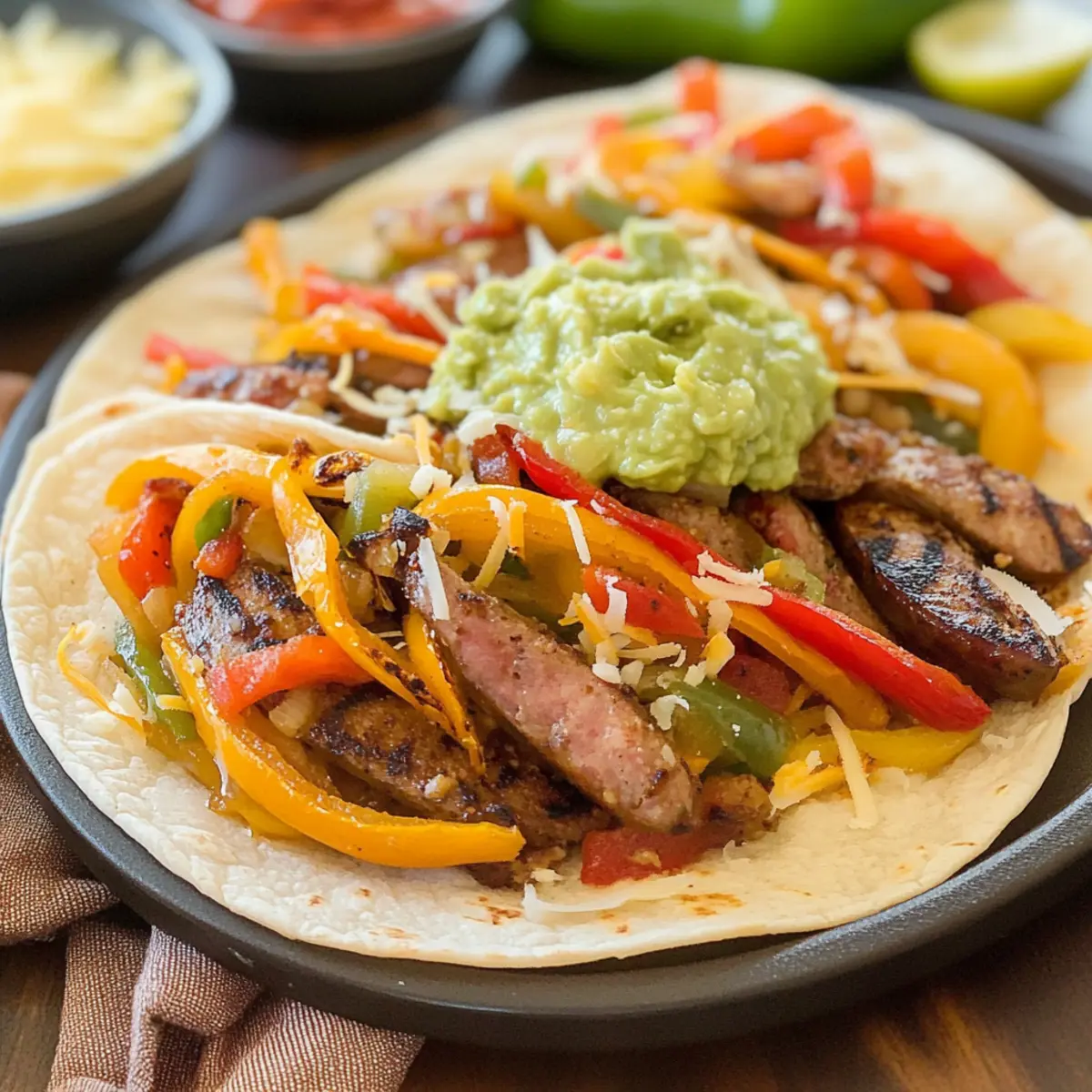 Lege die warmen Tortillas auf einen großen Teller. Fülle jede Tortilla großzügig mit der Wurst-Gemüse-Mischung. Füge nach Belieben Guacamole, geriebenen Käse, Salsa und Sauerrahm hinzu. Rolle die Tortillas auf und serviere die Schnelle und einfache italienische Fajitas sofort, während sie warm und frisch sind.