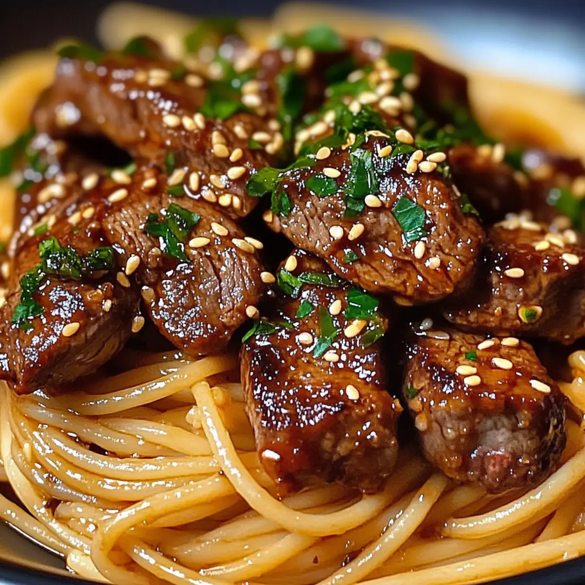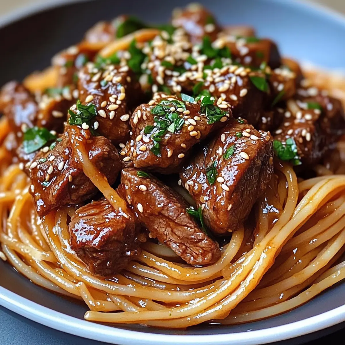 Nehmt die Süße und würzige Knoblauchsteak-Pasta vom Herd und richtet sie auf Tellern an. Garniert das Gericht mit gerösteten Sesamsamen und frischen Kräutern wie Petersilie oder Frühlingszwiebeln. Für einen extra Kick könnt ihr noch mehr zerstoßene rote Pfefferflocken hinzufügen. Serviert das Gericht sofort und genießt es in vollen Zügen!